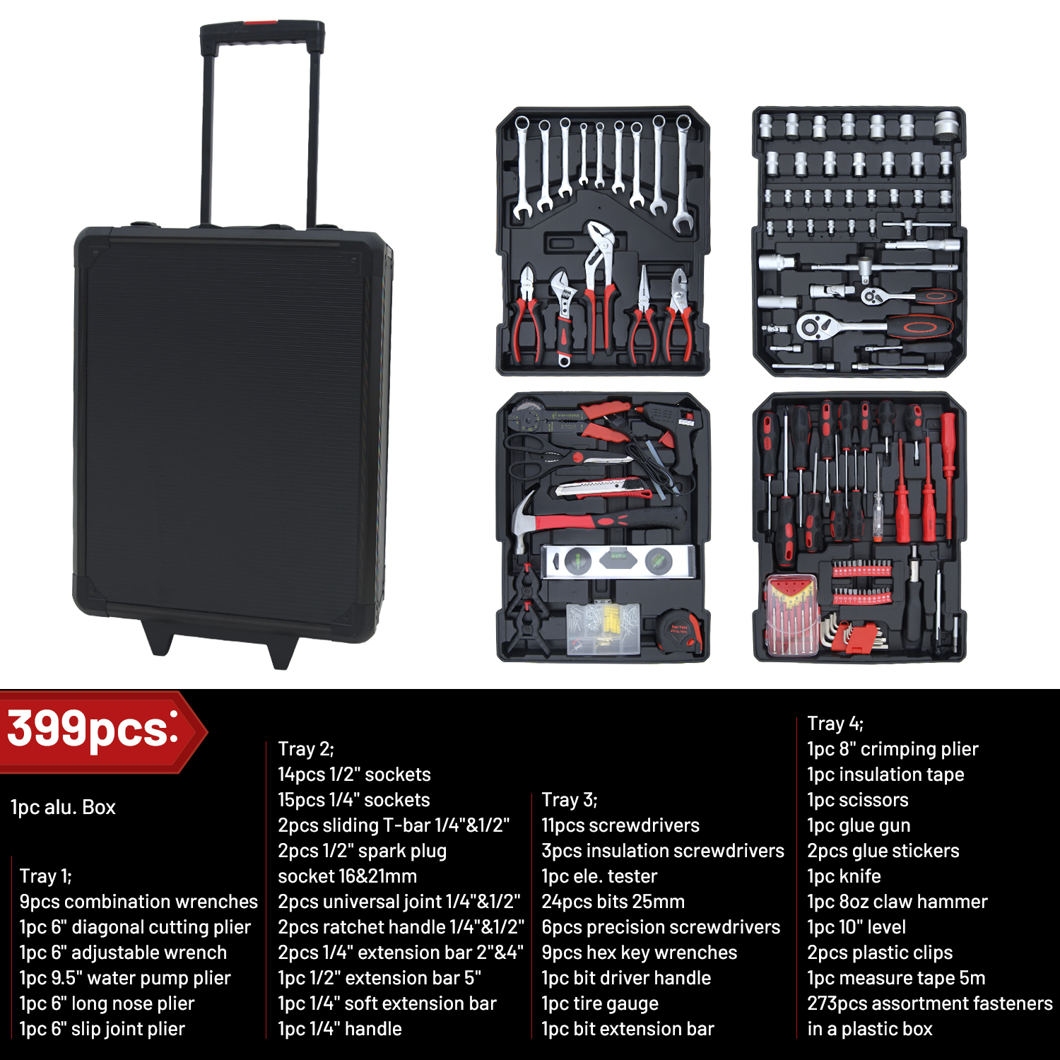 Inclui soquetes 1/4 'e 1/2 ', uma variedade de chaves, chaves de fenda, alicates e outras ferramentas de reparo essenciais para cobrir uma ampla gama de necessidades de manutenção.