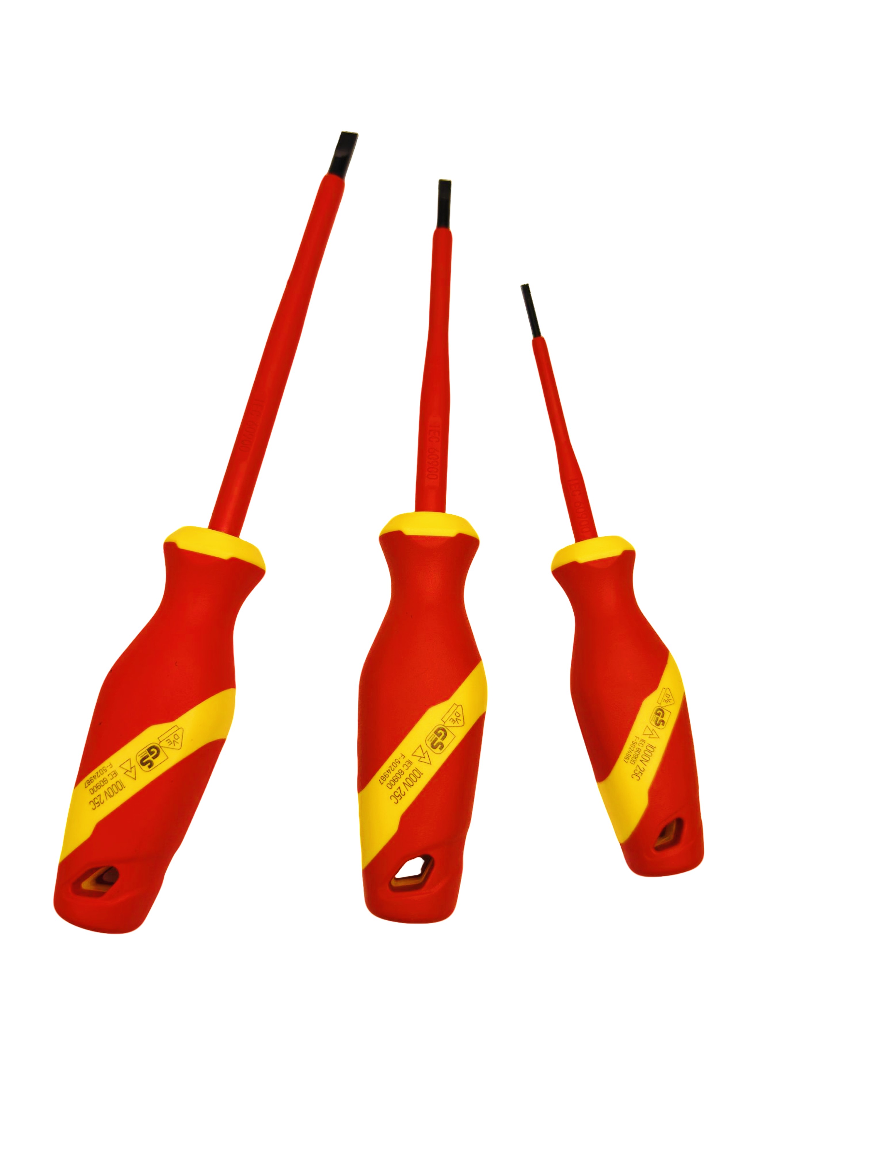Chaves de fenda isoladas (6 unidades): Uma mistura de pontas Phillips (PH0×75, PH1×80, PH2×100) e ranhuradas (SL2,5×75, SL4×100, SL5,5×125), com alças ergonômicas para controle de torque.