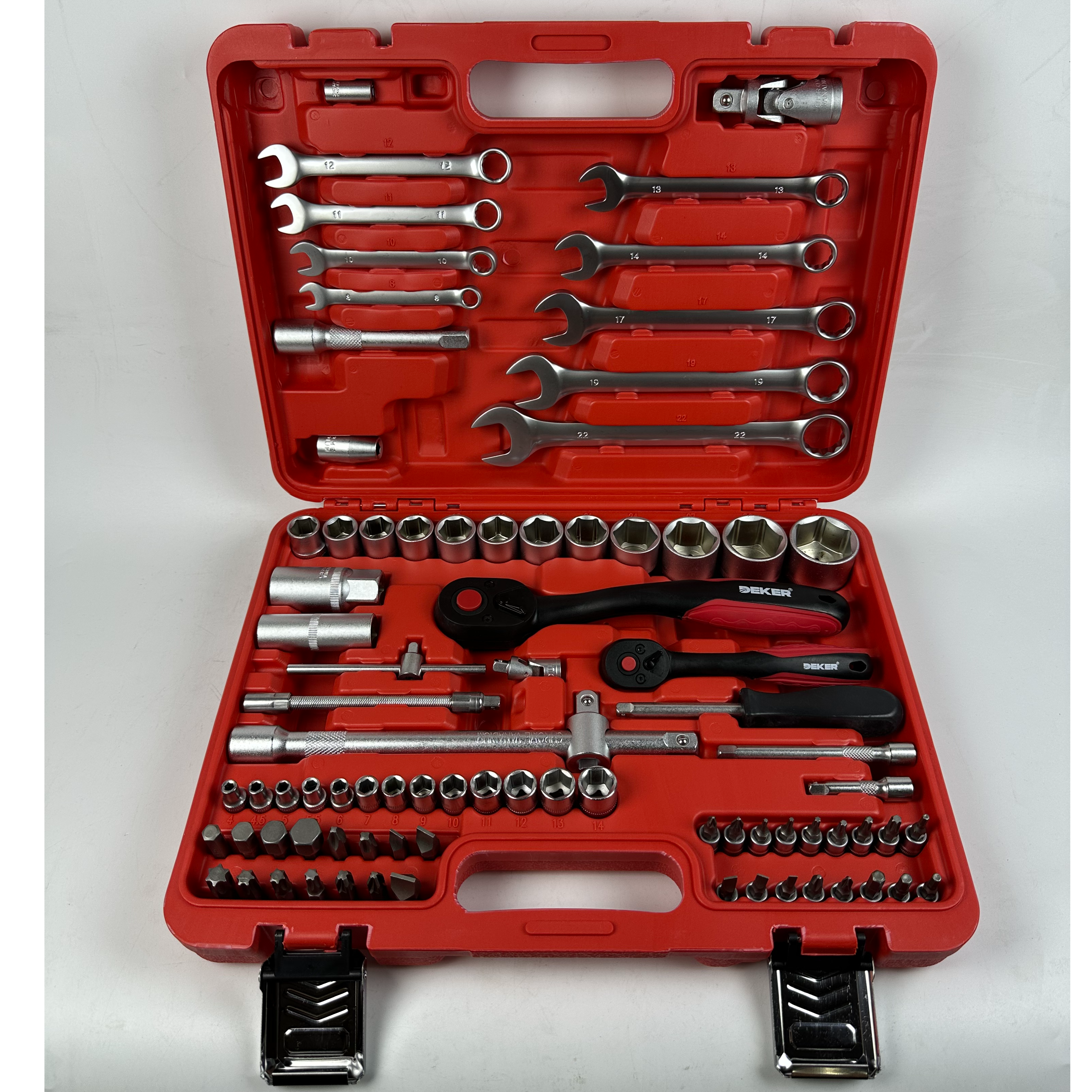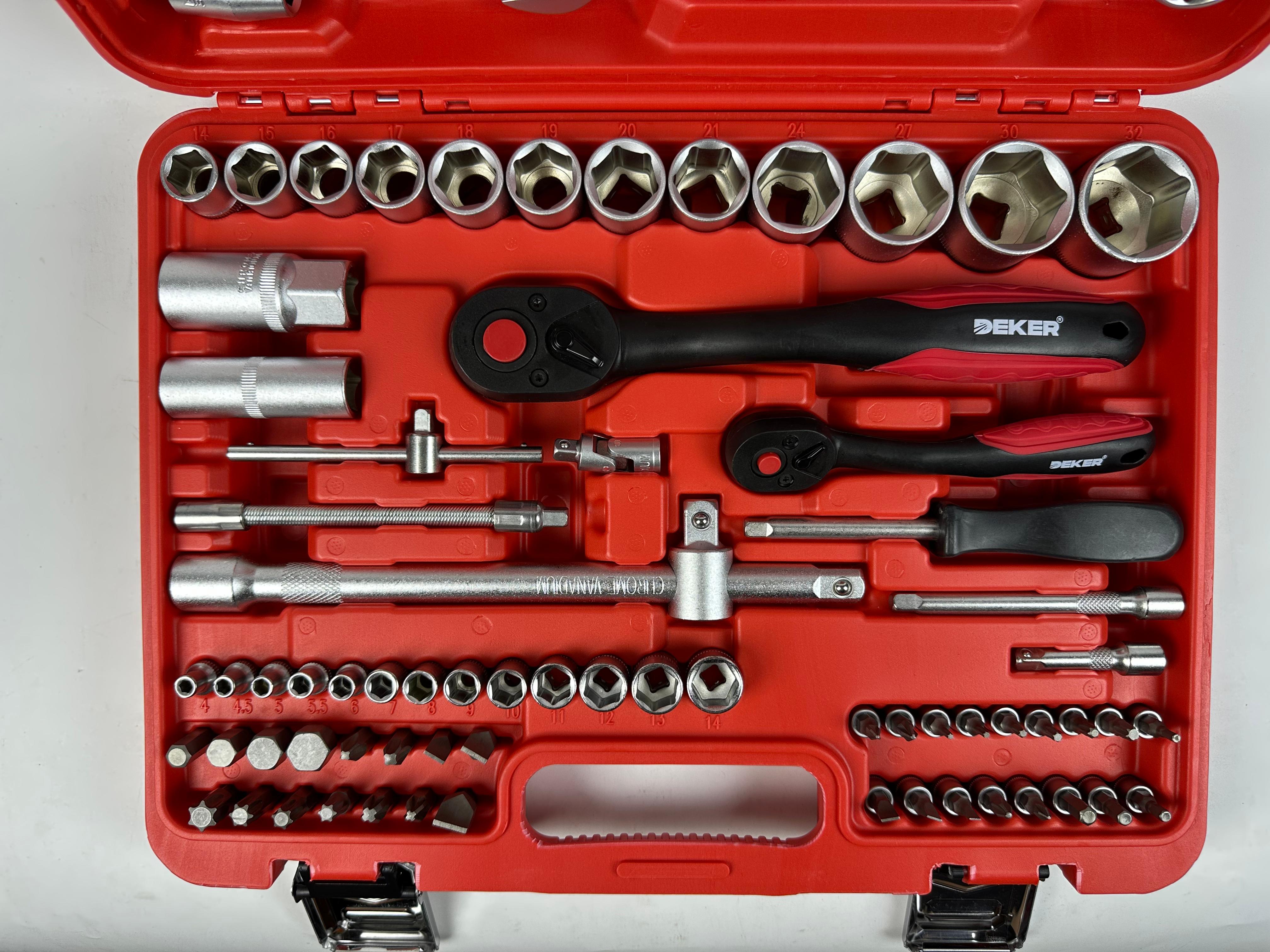 Inclui soquetes 1/4 'e 1/2 ', uma variedade de chaves, chaves de fenda, alicates e outras ferramentas de reparo essenciais para cobrir uma ampla gama de necessidades de manutenção.