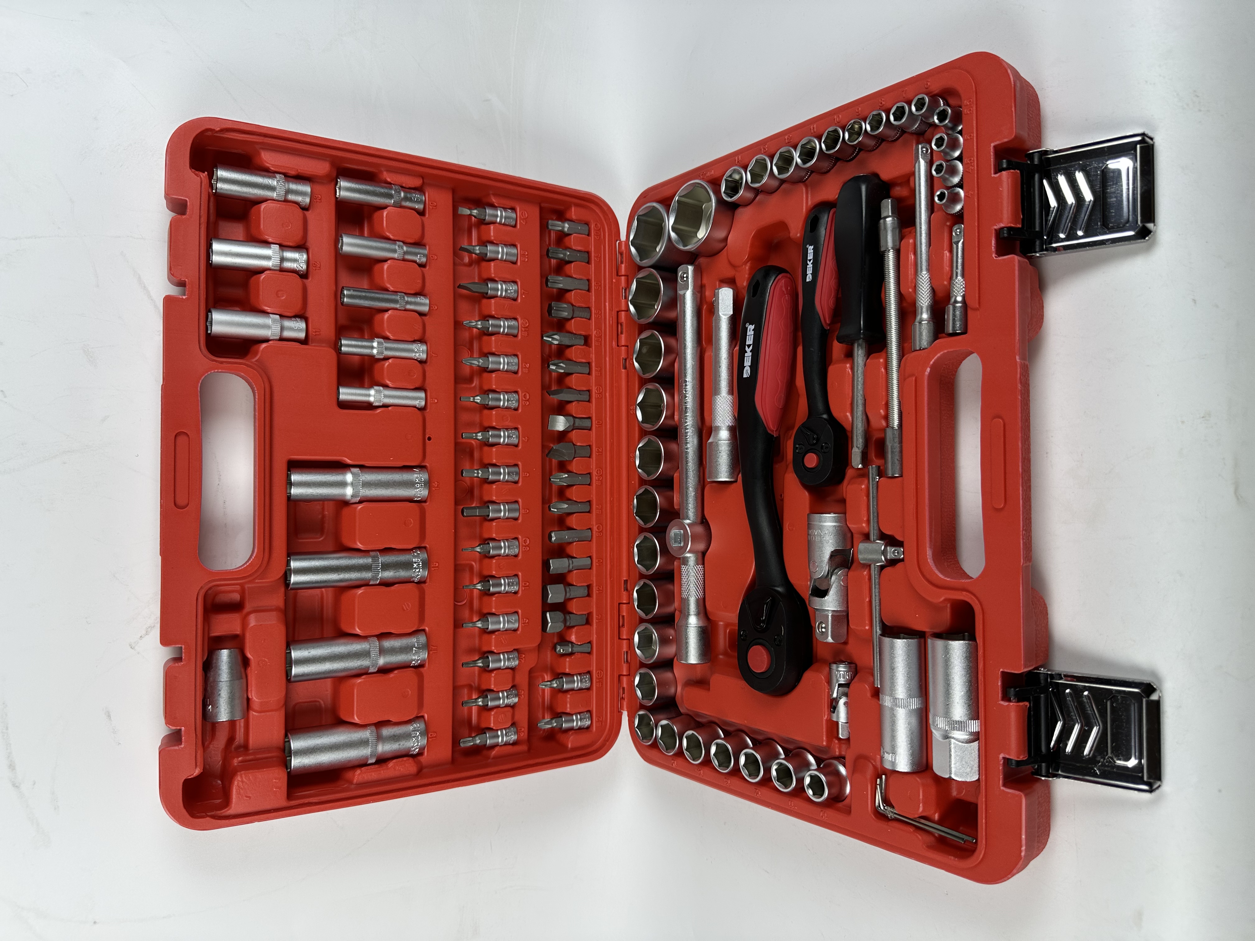 Inclui soquetes 1/4 'e 1/2 ', uma variedade de chaves, chaves de fenda, alicates e outras ferramentas de reparo essenciais para cobrir uma ampla gama de necessidades de manutenção.
