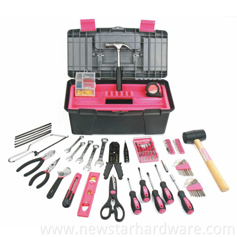 Conjunto de ferramentas de 70pcs. Kit de ferramentas de cores rosa na caixa de plástico. Com uma variedade de ferramentas manuais em casa. Incluindo: Caixa de 1-Hardware 1-8 onças Fita de Claw Hammer 1-Meassure 3m Chaves de Chave de Chave de 20 bits de 20 bits de 20 bits, alça de driver de 1 bit de 1 bits ...