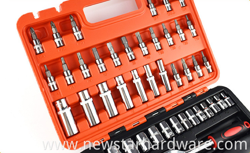 A caixa de ferramentas está totalmente equipada com uma variedade de tamanhos de chaves, soquetes, bits de chave de fenda e muito mais. Ele pode se adaptar a uma ampla gama de cenários de reparo e é adequado para uso doméstico, garagens e reparos profissionais em pequena escala.